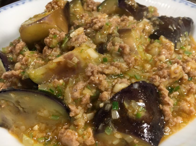 フライパンに炒め用の油を多めに入れ、茄子を炒め、軽く火が通ったら、いったん、お皿に取り出す